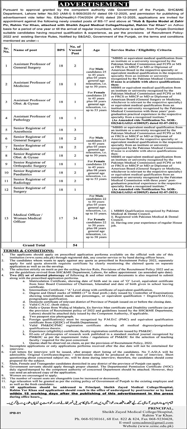 The college is affiliated with the 1228-bedded Sheikh Zayed Hospital for undergraduate and postgraduate clinical training. This hospital has all the tertiary care health facilities with 25 disciplines recognized by PMDC and CPSP for post graduate training, 2nd tertiary care Institution after KEMU Lahore having maximum number of disciplines accredited by CPSP and affiliated with UHS Lahore for MBBS, MS & MD. The hospital has well established state of the art modern diagnostic facilities; CT, CT Angio, MRI, Mammography, Fluoroscopy, Urodynamics, PCR, Hormonal assay, BERA (Brain stem evoke response audiometry), modern diagnostic ophthalmological equipment. Therapeutic facilities including all types of Microscopic / laparoscopic / Endoscopic procedures, lithotripsy, arthroscopy, joint replacement, re-union of amputated parts, all sort of dental and maxillofacial surgery, all type of ophthalmic surgeries including Vitreo-retina surgery, Oculoplasty and low vision aid clinic, vascular surgery and cardiac surgery and cardiology department with facility of angiography, angioplasty and Coronary artery bypass surgery (CABG). There is also a well-established state of the art Adults, Pediatric & Neonatal ICU and Thalassemia center. Newly built 124 bedded emergency block have all facilities to cope up with all sort of emergencies.